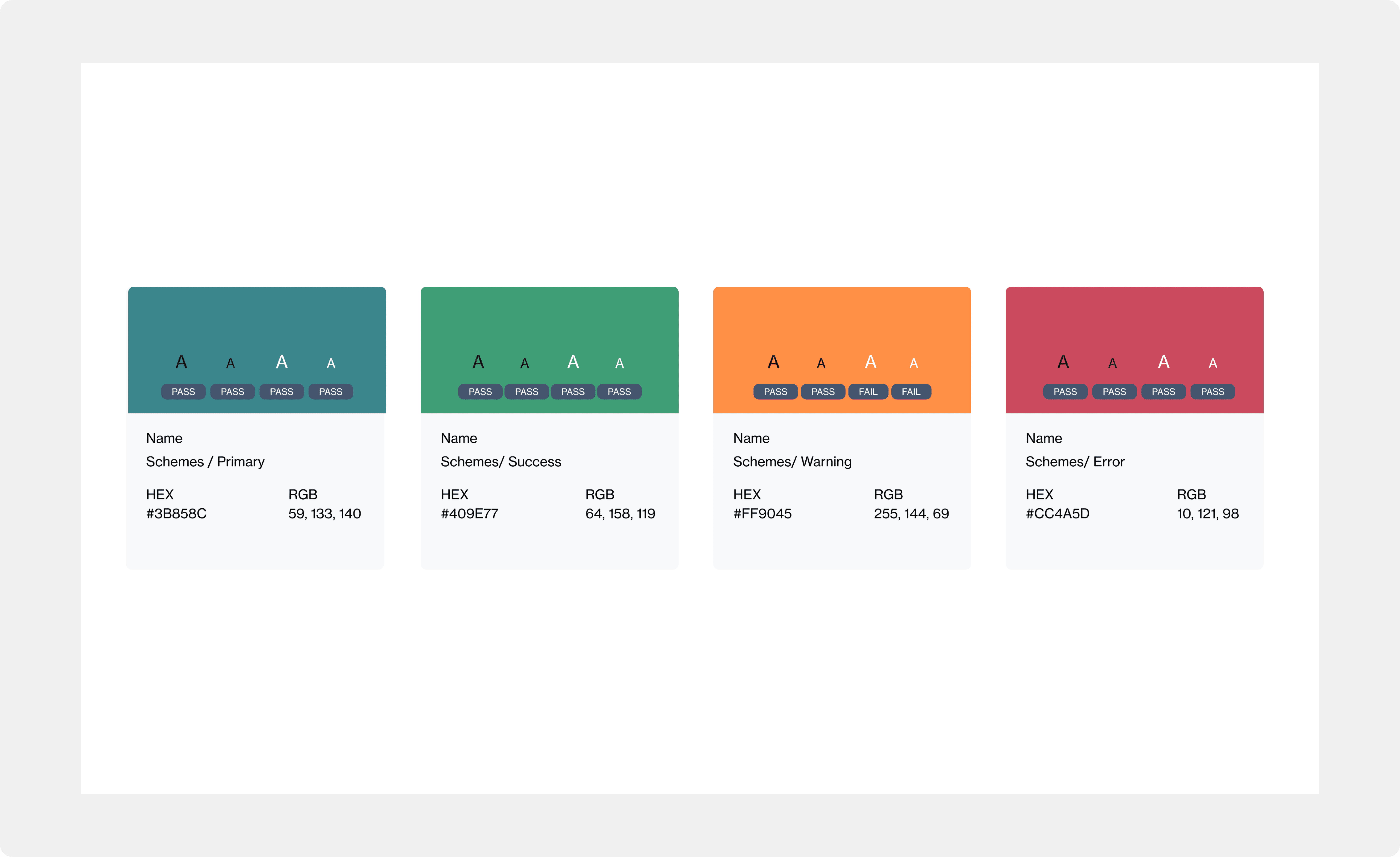Colour was redefined by intent (Primary, Success, Warning, Error) and validated to WCAG AA.