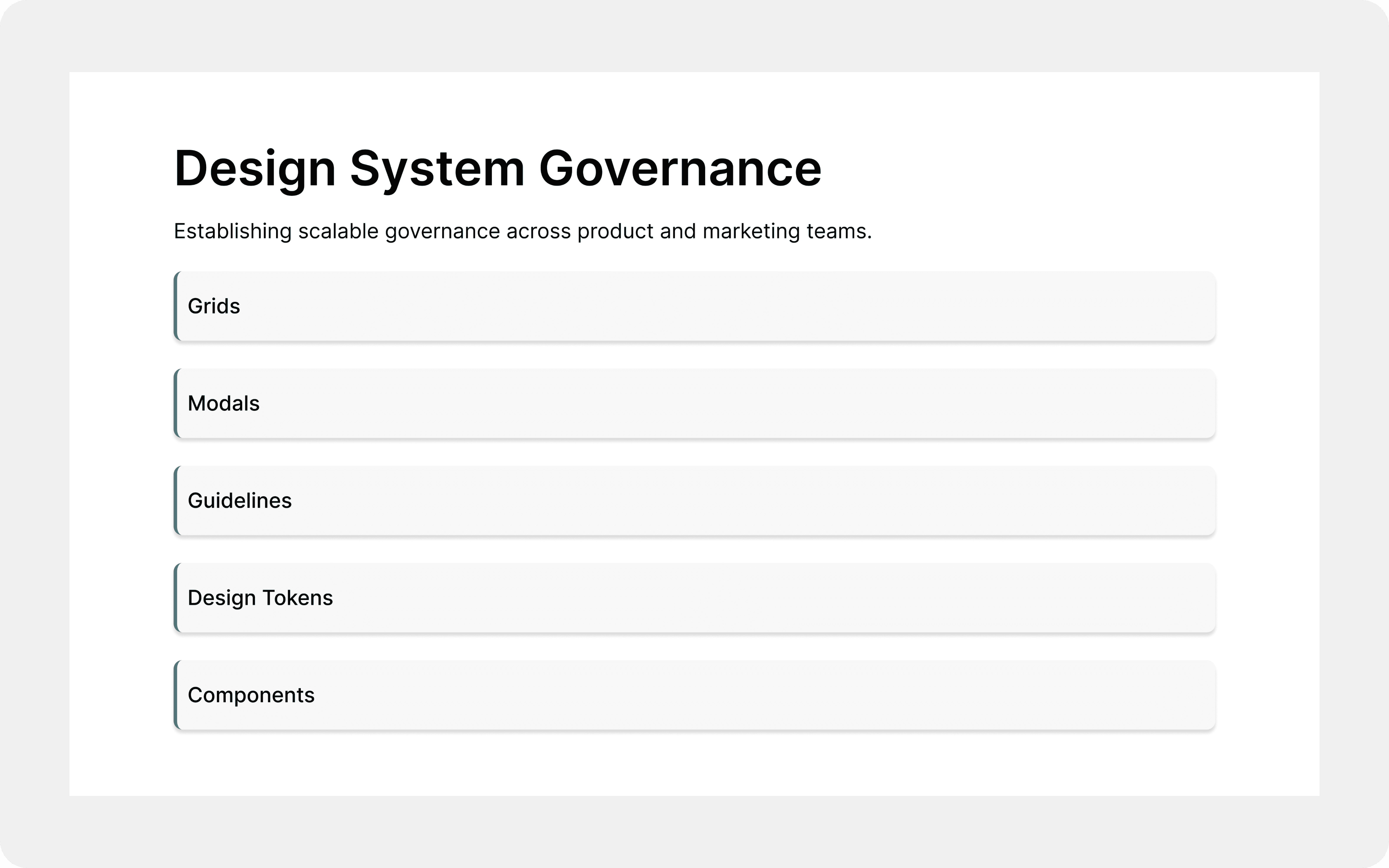 To prevent interpretation drift, I separated foundations (tokens, grids), reusable UI (components, patterns), and usage governance (guidelines). This made application logic explicit across teams.