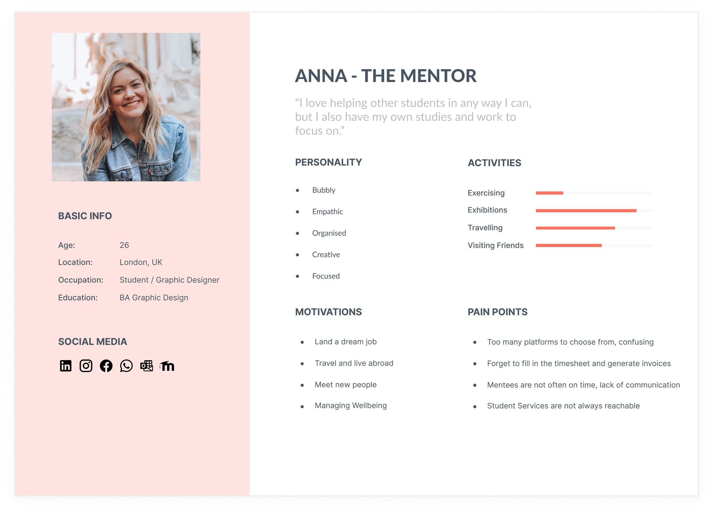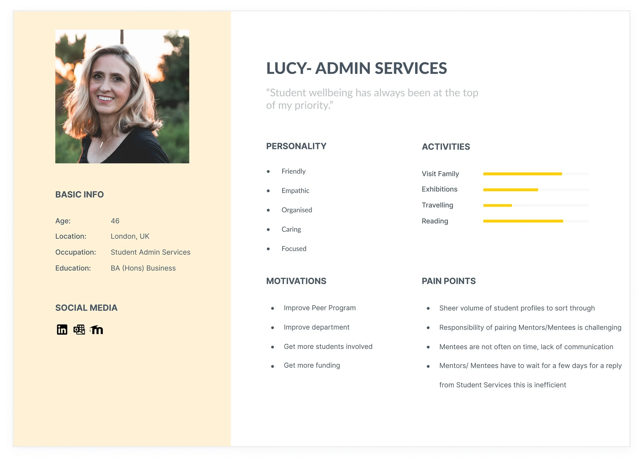 Based on insights from interviews, I identified three key user groups involved in the peer mentoring journey: admin staff, mentors, and mentees. To better empathise with their needs and guide design decisions, I created user personas representing each group.