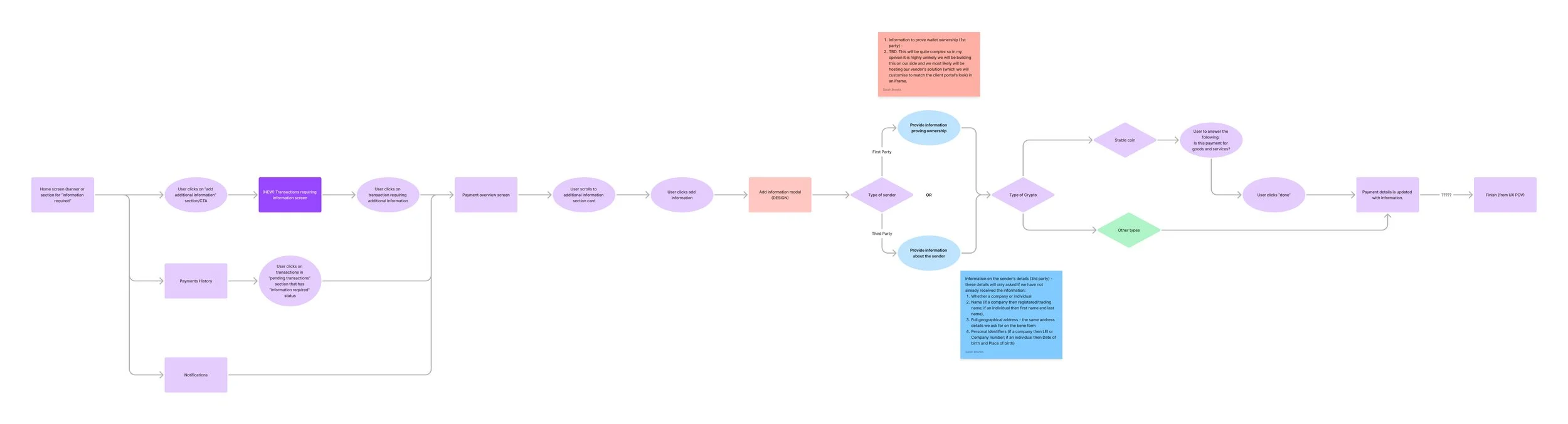 During Ideation, I collaborated with the eCommerce Designer in a workshop to annotate legacy screens with post-its, exploring seamless integration of new Travel Rule elements—like the ‘Info Required’ status and updated form modal—while minimising user disruption.